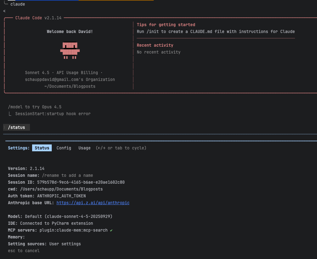 Once it's running, type /status to see your current configuration. If everything is set up correctly, you should see that the Anthropic base URL has changed to point to the z.ai API: